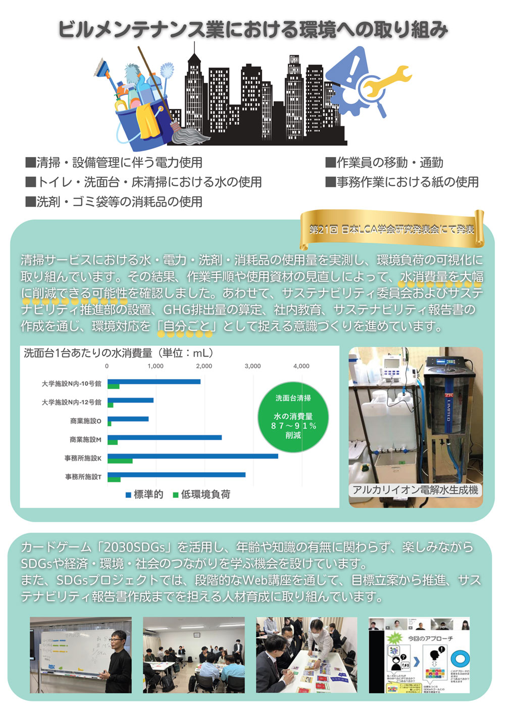 ビルメンテナンスという日常業務が社会・環境に与える影響を「自分ごと」として捉え「ビジネスを通じて社会・環境課題を解決する」ことを基本姿勢としています。サステナビリティ推進部および委員会を中心に、方針策定や目標管理、従業員への浸透を図り、グループ全体で継続的な環境負荷低減に取り組んでいます。また、単独の取り組みにとどまらず、外部との連携や自社の現場で得た知見の共有を進めています。環境対応を長期的な挑戦と位置づけ、できることから着実に行動し、共創を通じて成長していく企業を目指しています。