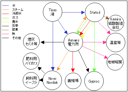 他が参加するネットワークが主体となっており、参加企業間でお互いの利益(経済、環境)を考え、それぞれの廃棄物を原材料として利用するために取引している。この協力関係は、資源の節約と環境負荷の低減に貢献している。このうちアスネス発電所は、電力供給に加え都市への熱供給、及び製油会社、医薬品会社へのスチーム供給を行っている。電気と熱を同時生産することにより、別生産のときと比べ燃料の利用効率が30%も上がった。